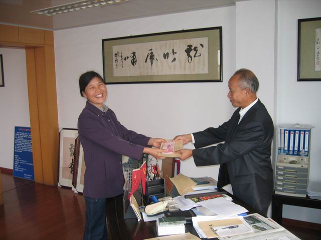 在学校2007年高考又创新佳绩的大好形势下,我校高三三位优秀毕业生王白茹,顾磊,蒋星晨喜获"希望工程圆梦大学"电力助学金,资助标准为4000/人。图为学生家长代表从学校曹校长手中接过助学金。
