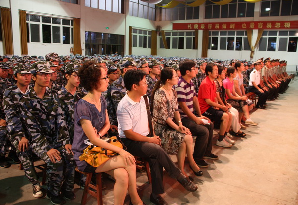 从踏入军训营地开始,一切都是军事化管理,原来学校的班级编排此时已由中队称号代替。由于本阶段有两所学校同时接受军训,所以我校原先的1—12班分别被称为16—27中队。 13日晚饭过后,同学们就换上了由军训基地统一提供的军人迷彩服,接着参加了基地的安全教育。 晚十点正,南通市天星湖中学高一新生军训开营仪式正式开始。身着草绿色军装、置身草绿色方队、目睹英姿勃发的教官、耳听铿锵有力的口令,同学们的心灵在一种全然未曾体验过的神圣的氛围中经受洗礼。 开营仪式上,我校葛红军校长助理以及基地领导、教官代表分别讲话,他们勉励同学们经受磨练,锻造意志,提高素质。学生代表也作了激情洋溢的发言。最后全体参训学生进行了庄严的宣誓。 据了解,本次军训教官来自解放军理工大学(号称军中的清华、北大),多为大三生,他们不仅素质一流,而且体格健壮、相貌堂堂。相信教官们的调教会让那些父母无微不至呵护下的文弱书生们变成铮铮硬汉、飒爽女子。