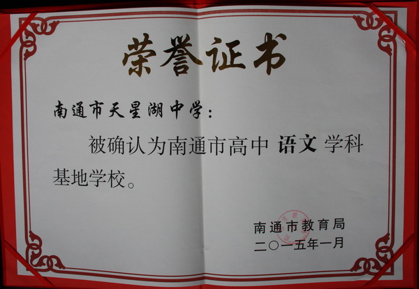 近日,南通市教育局向我校发来荣誉证书,确认天星湖中学为“南通市语文学科基地学校”。