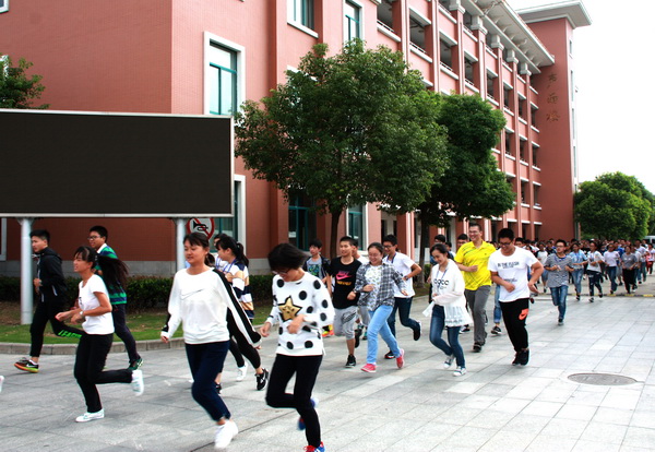 2016年9月18日上午10:08分,一阵急促而凄厉的警报声在天星湖中学校园上空突然响起。紧接着,各班同学在老师的组织指挥下,迅速有序地跑出教室,跑下楼梯,然后按照预定路线,向防灾疏散地——学校运动场奔去。