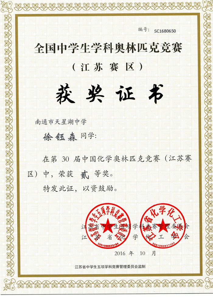 喜报 在2016年全国生物奥赛中我校32人获得江苏省二等奖、三等奖