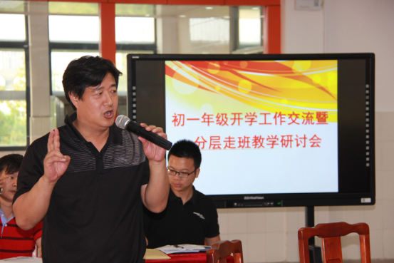 顾建兵副校长首先指出召开此会议的原因和重要性。接着由负责初一级部教学的教务处郭继荣老师就目前初一分层走班教学在教学和管理等方面交流了具体的想法。郭继荣老师首先点赞初一“三有”教师:做有思想、有方法、有效果的老师;第二提出日常管理要有吃苦意识。第三指出教学方面要有研究意识。然后政教处张建华老师回顾了开学开展的工作,部署接下来要落实的举措。他希望大家能克服困难,团结协作,不断创新,为把我校发展为南通有地位、省内有影响的名校而共同努力!教务处郭小平主任从宏观层面分析了分层走班意义所在,又从微观方面提出具体可行的措施:分别从备课、授课、作业、辅导等教学环节作出了具体的说明。她指出我校将继续深化课改,使每个学生在东方中学都能拥有自己高增量成长的节奏。最后教师代表分别从班级管理、师生关系、课堂教学、自习课管理等方面交流了自己在分层走班教学中的部分想法。