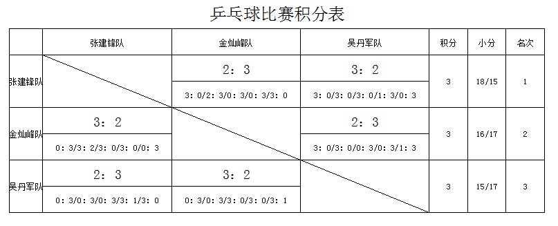 经过三轮循环比赛出现了戏剧性一幕,金灿峰队32赢张建锋队,吴丹军对32赢金灿峰队,张建锋队32赢吴丹军队,每队交叉比赛后各队大比分均相同。经裁判组与三小队队长共同结算比赛小局分后,张建锋队赢18局输15局,金灿峰队赢16局输17局,吴丹军队赢15局输17局,由小局分分出一、二、三名。