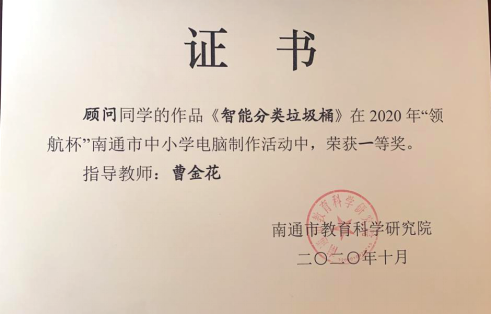 近日,南通市教科院公布了2020年南通市“领航杯”中小学电脑制作活动评比结果。我校初二16班顾问同学的3D创意设计作品《智能分类垃圾桶》荣获大市一等奖,初三19班詹雅馨同学的绘画作品《奋斗在“疫”线》荣获大市二等奖。