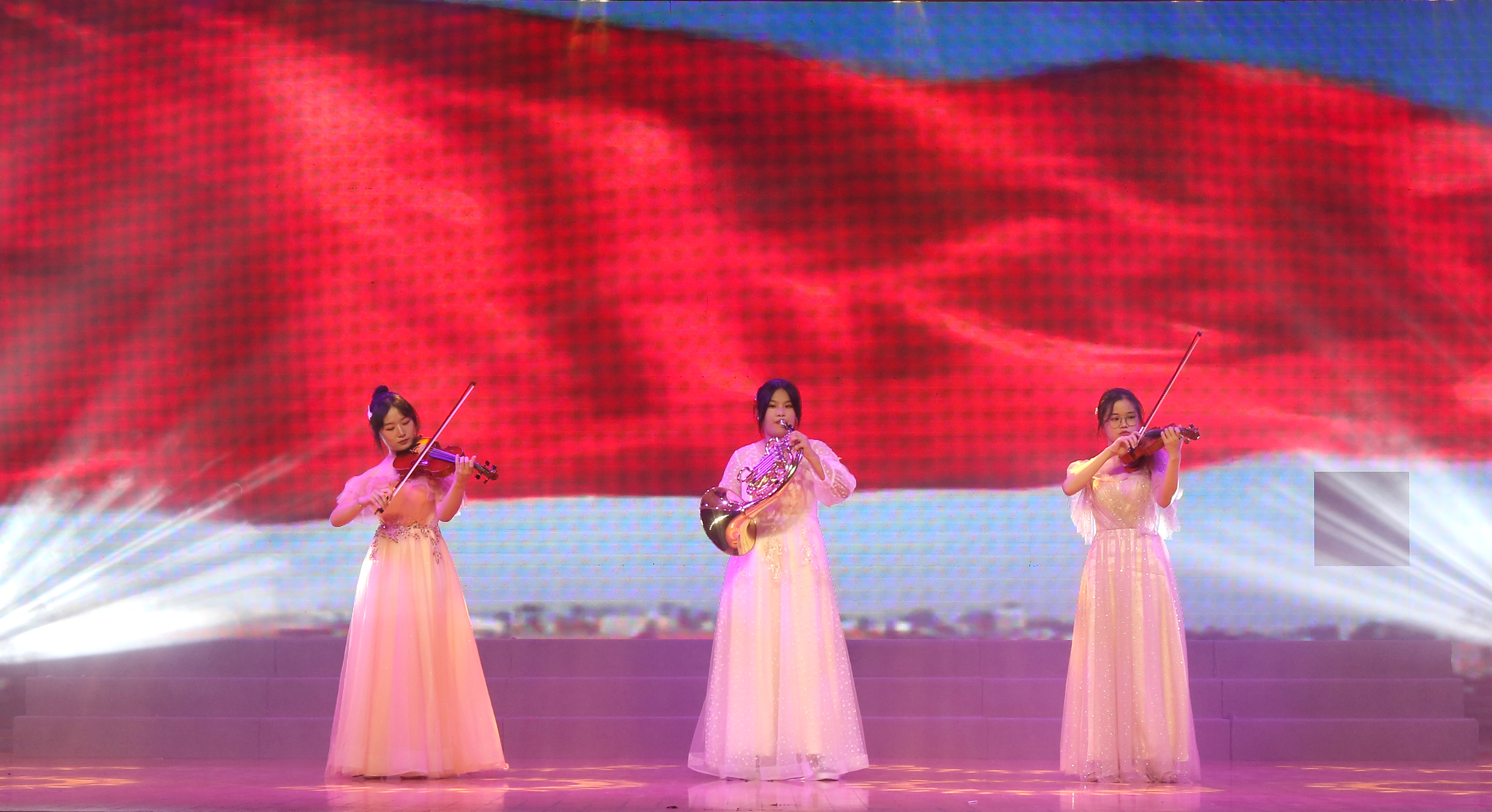 我校音乐特长生马甜欣、陈果、李文欣带来的器乐重奏《我和我的祖国》抒发了小我对大国的深厚情谊。