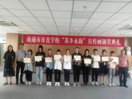 今天,由我校美术组兰老师和赵老师带队,组织7名学生参加了南通市市直学校“苏乡永助”宣传画颁奖仪式,我校孩子获得特等奖2名,一等奖1名,二等奖4名。美育植根于校园,孕育着我们的花朵,孩子们正在自己的花期中盛开。