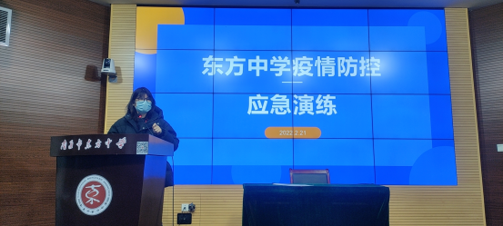 为坚决打赢校园疫情防控阻击战,切实保障师生健康和校园公共卫生安全,进一步提高学校应对疫情的处置能力,2月21日,东方中学组织各部门负责人、全体班主任开展了疫情防控应急处置演练活动。活动分两个校区同步进行。