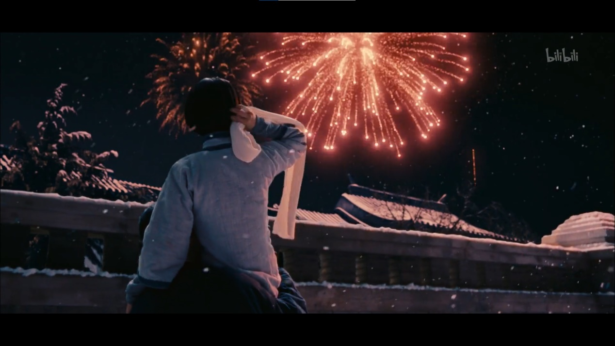 “毛泽东杨开慧共赏焰火”一幕中,毛泽东抱起杨开慧让其坐在肩上,这一对青年男女的爱情开始萌芽。雪,是寒冷的,是无情的;焰火,是温暖的,是动情的。除夕夜里,这是送别旧生活、迎来新生活的象征。画面中毛杨二人位于左下角,焰火盛放于天际之上,构图对比鲜明:即使是毛泽东这样心怀天下的人物也有着富有情感的一面;即使是杨开慧这样英雄果敢的巾帼人物也有着小鸟依人的幸福一面;黑暗的旧世界即将被推翻,光明的、赤色的新世界即将迎来曙光!