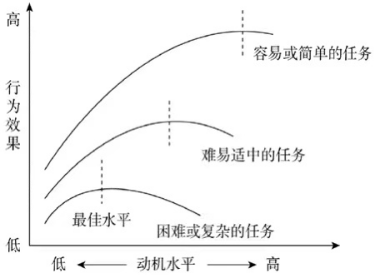 心理学家耶克斯和多德森的研究表明,动机强度与学习效率之间并不是一种线性关系,而是倒U形曲线关系。中等强度的动机最有利于任务的完成,即动机强度处于中等水平时,学习效率最高。各种活动都存在一个最佳的动机水平,动机不足或过分强烈都会导致学习效率下降。此外,动机的最佳水平还随任务性质的不同而不同:在学习较复杂的问题时,动机强度的最佳水平点会低些;在学习任务比较简单时,动机强度的最佳水平点会高些。例如,某生比较擅长数学,那么较高的目标和期望可使学习成效达到最佳水平、在考试中取得较好的成绩。