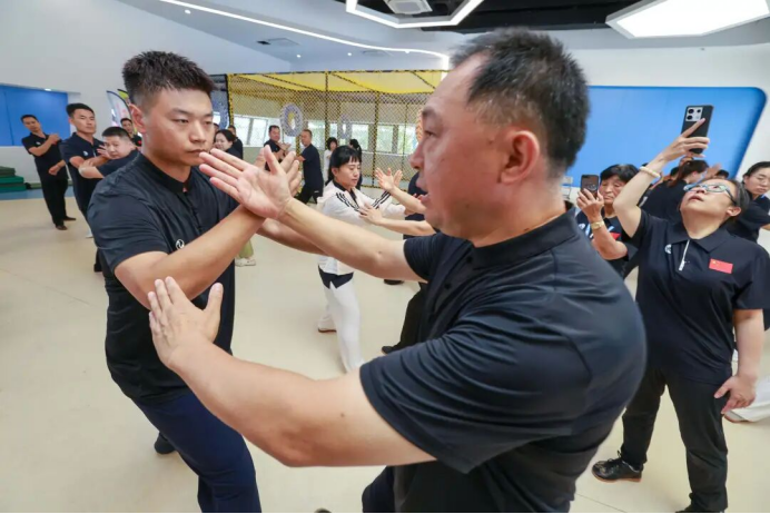 实战太极推手技术讲解时,黄康辉教授亲自示范,从基本步法、身法到推手技巧,一一详解。教师们认真观察、仔细模仿,逐渐掌握了太极推手的精髓。通过反复练习和相互切磋,大家的技艺得到了显著提升。