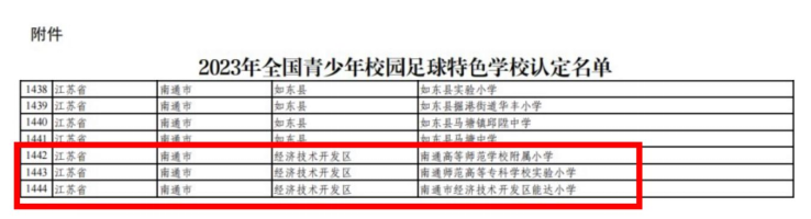 近日,教育部网站发布《关于2023年全国青少年校园足球特色学校认定结果的公示》,我区3所学校荣登榜单,分别是:南通高等师范学校附属小学、南通师范高等专科学校实验小学、南通市经济技术开发区能达小学。