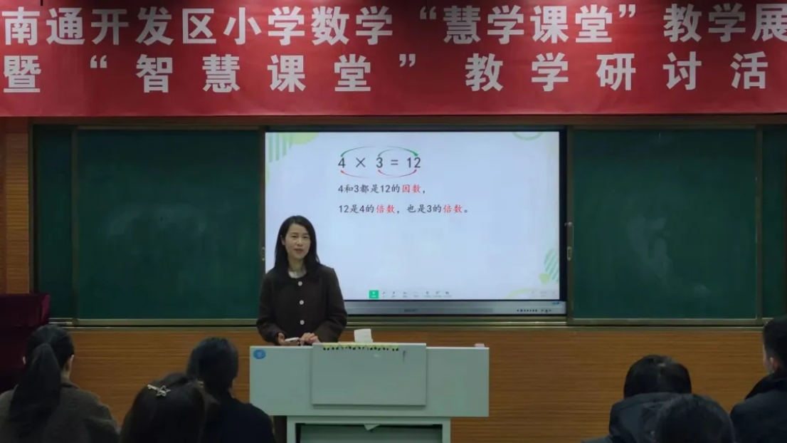 通州区家纺城小学方嵘老师和竹行小学蒋凯敏老师执教同一节课《因数与倍数》。
