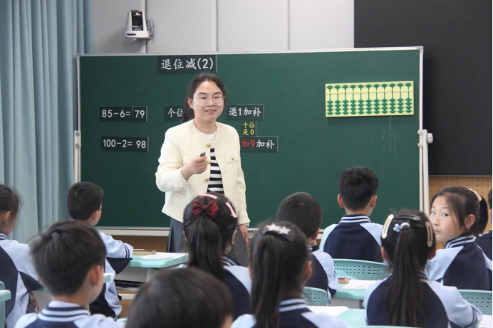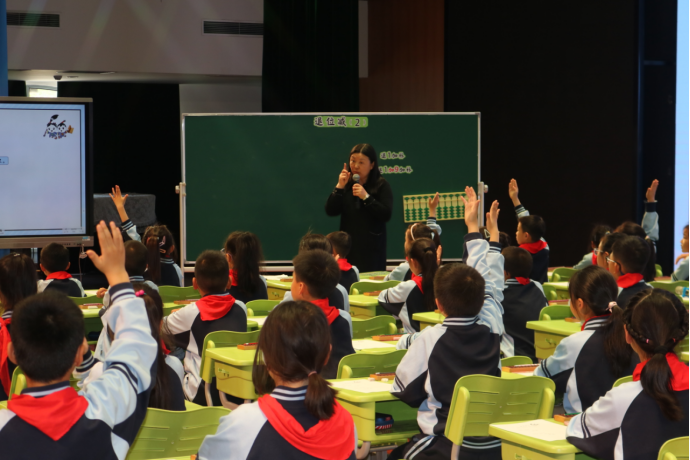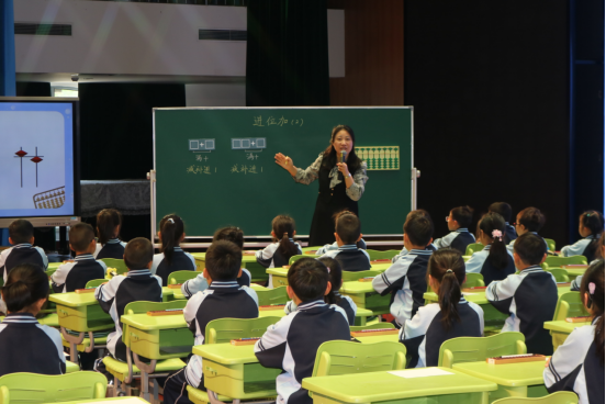 南通市开发区实小教育集团新河校区徐宝琴老师执教《进位加(2)》。徐老师通过空拨复习唤醒学生的珠算旧知,从一位数加一位、到两位数加一位数、再到两位数加两位数的进位加,引导学生进行知识迁移,总结拨珠方法,并通过编题思考进位条件并归纳规律。