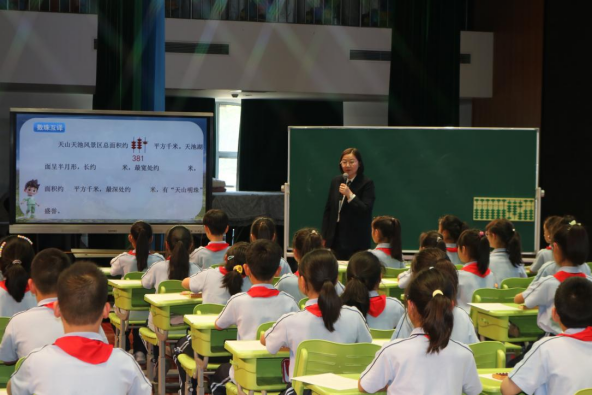 南通市郭里园小学吴晓萍老师执教《两位数乘整十数》。吴老师从《我多想去看看》课文引入创设情境,实现了与语文跨学科教学,引导学生完成珠心算的学习,从试拨到课件演示、同桌互拨、空拨校对,层层递进,助力学生内化珠算技能。