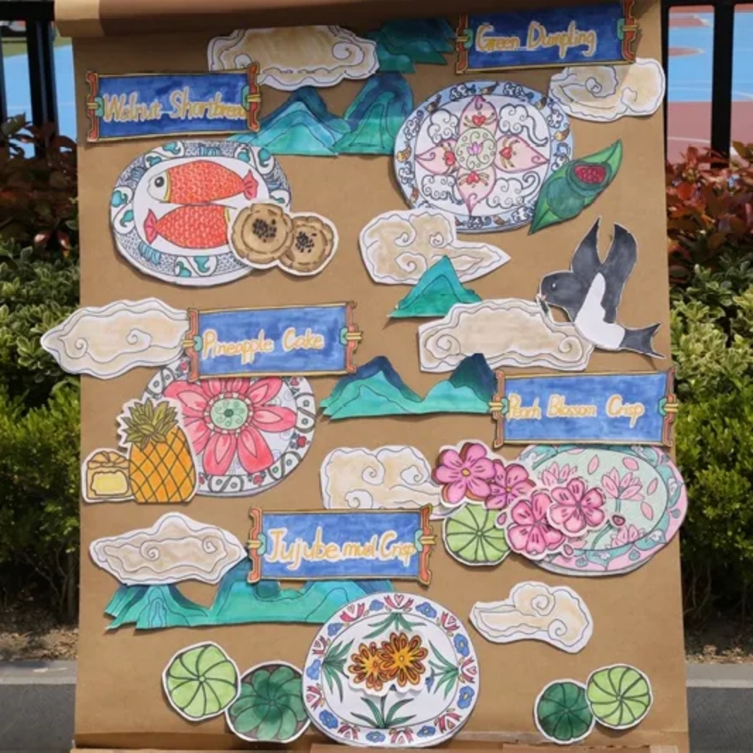 步入春光明媚的校园,首先映入眼帘的是实小龙娃们精心准布置的“中国传统文化展”。该展以“传统美食”、“缤纷国粹”、“二十四节气”及“祖国山河”四大主题呈现中国传统文化精髓。孩子们以图文并行的方式叙述,用雅韵绘画传承中式审美,用丰富英语讲述中国故事。