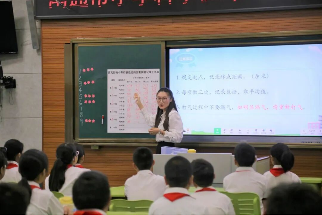 来自如东掘港小学的杨滢萱老师执教《做一辆喷气式小车》,通过控制变量法研究改变气球大小,小车重量,喷嘴粗细对小车行驶距离的影响。充分调动学生对于车动力的思考。