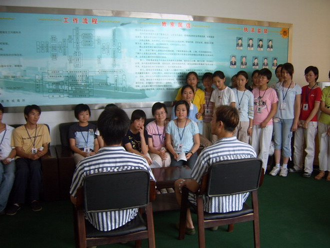 图为学生代表们在戒毒所听讲解员讲解有关知识