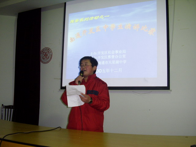 12月28日下午,由开发区社会事业局、开发区推普办公室举办的南通开发区中学生演讲比赛在我校第二阶梯教室举行,来自全区各个中学的选手进行了激情洋溢的演讲,图片如下: |